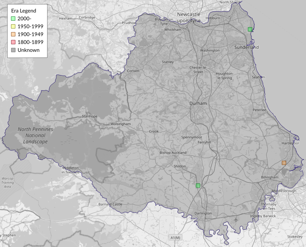 This map shows all records of - Bucculatrix cristatella in the Durham (VC66) database per monad (1km grid square). The map can be explored further by zooming and panning, can be reset using the button on the left, and can be filtered by selecting the era. Click on a monad to view a full list of species recorded in it, or its containing hexad (10km grid square).
