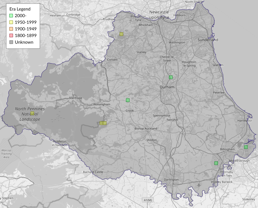 This map shows all records of - Coleophora alticolella in the Durham (VC66) database per monad (1km grid square). The map can be explored further by zooming and panning, can be reset using the button on the left, and can be filtered by selecting the era. Click on a monad to view a full list of species recorded in it, or its containing hexad (10km grid square).