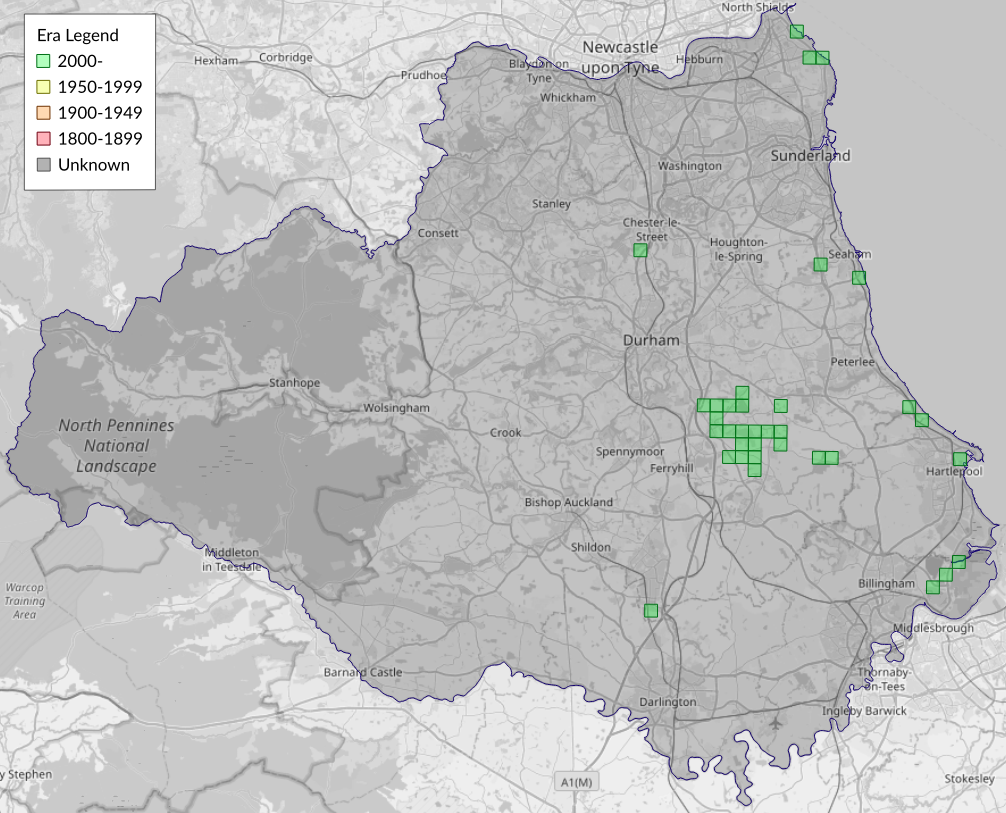 This map shows all records of - Coleophora argentula in the Durham (VC66) database per monad (1km grid square). The map can be explored further by zooming and panning, can be reset using the button on the left, and can be filtered by selecting the era. Click on a monad to view a full list of species recorded in it, or its containing hexad (10km grid square).