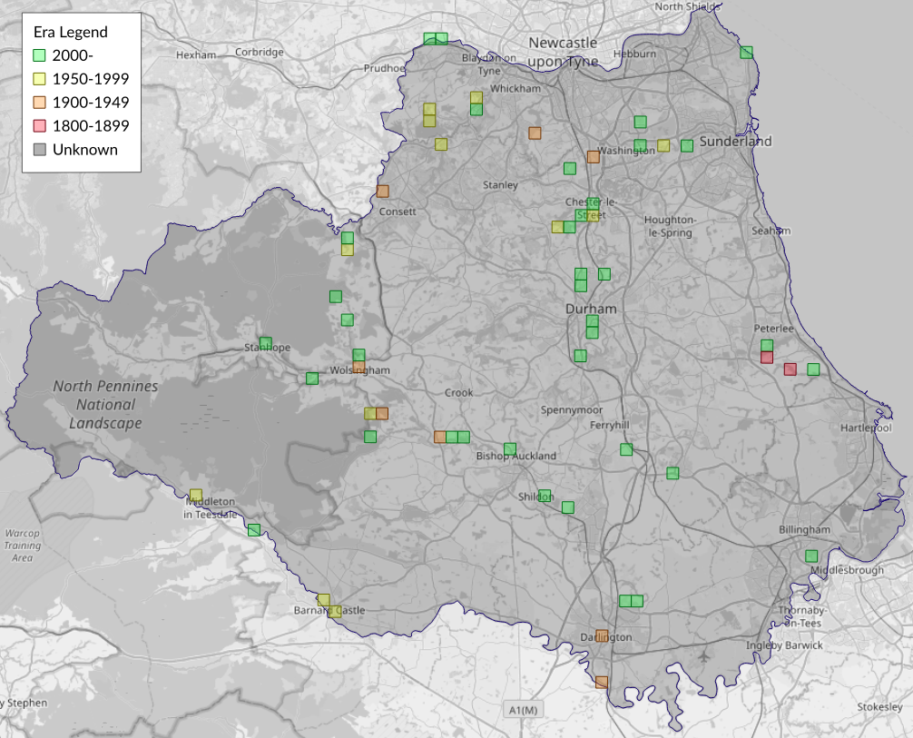 This map shows all records of Blue-bordered Carpet - Plemyria rubiginata in the Durham (VC66) database per monad (1km grid square). The map can be explored further by zooming and panning, can be reset using the button on the left, and can be filtered by selecting the era. Click on a monad to view a full list of species recorded in it, or its containing hexad (10km grid square).
