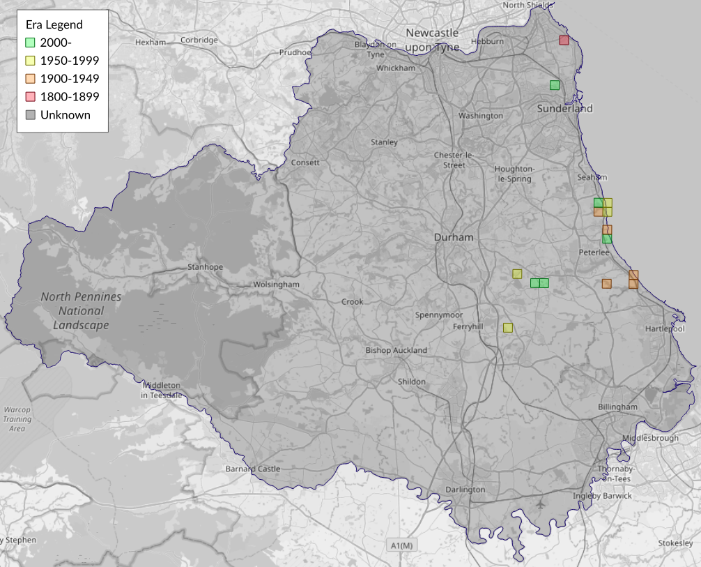 This map shows all records of Chalk Carpet - Scotopteryx bipunctaria in the Durham (VC66) database per monad (1km grid square). The map can be explored further by zooming and panning, can be reset using the button on the left, and can be filtered by selecting the era. Click on a monad to view a full list of species recorded in it, or its containing hexad (10km grid square).