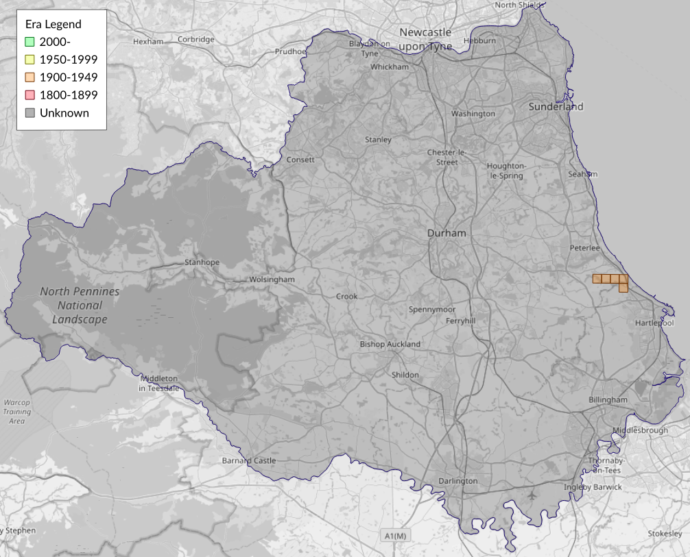 This map shows all records of - Phyllonorycter insignitella in the Durham (VC66) database per monad (1km grid square). The map can be explored further by zooming and panning, can be reset using the button on the left, and can be filtered by selecting the era. Click on a monad to view a full list of species recorded in it, or its containing hexad (10km grid square).