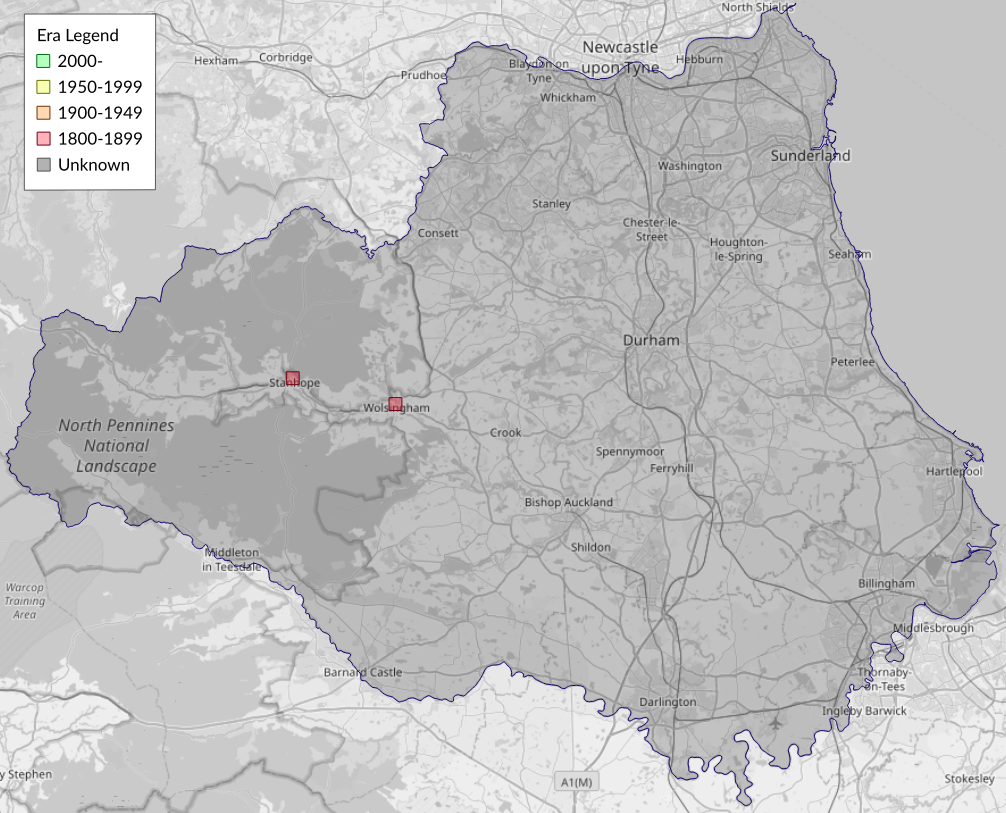 This map shows all records of - Stigmella glutinosae in the Durham (VC66) database per monad (1km grid square). The map can be explored further by zooming and panning, can be reset using the button on the left, and can be filtered by selecting the era. Click on a monad to view a full list of species recorded in it, or its containing hexad (10km grid square).