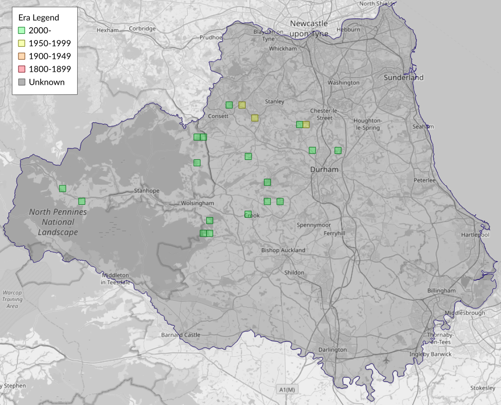 This map shows all records of - Stigmella sorbi in the Durham (VC66) database per monad (1km grid square). The map can be explored further by zooming and panning, can be reset using the button on the left, and can be filtered by selecting the era. Click on a monad to view a full list of species recorded in it, or its containing hexad (10km grid square).