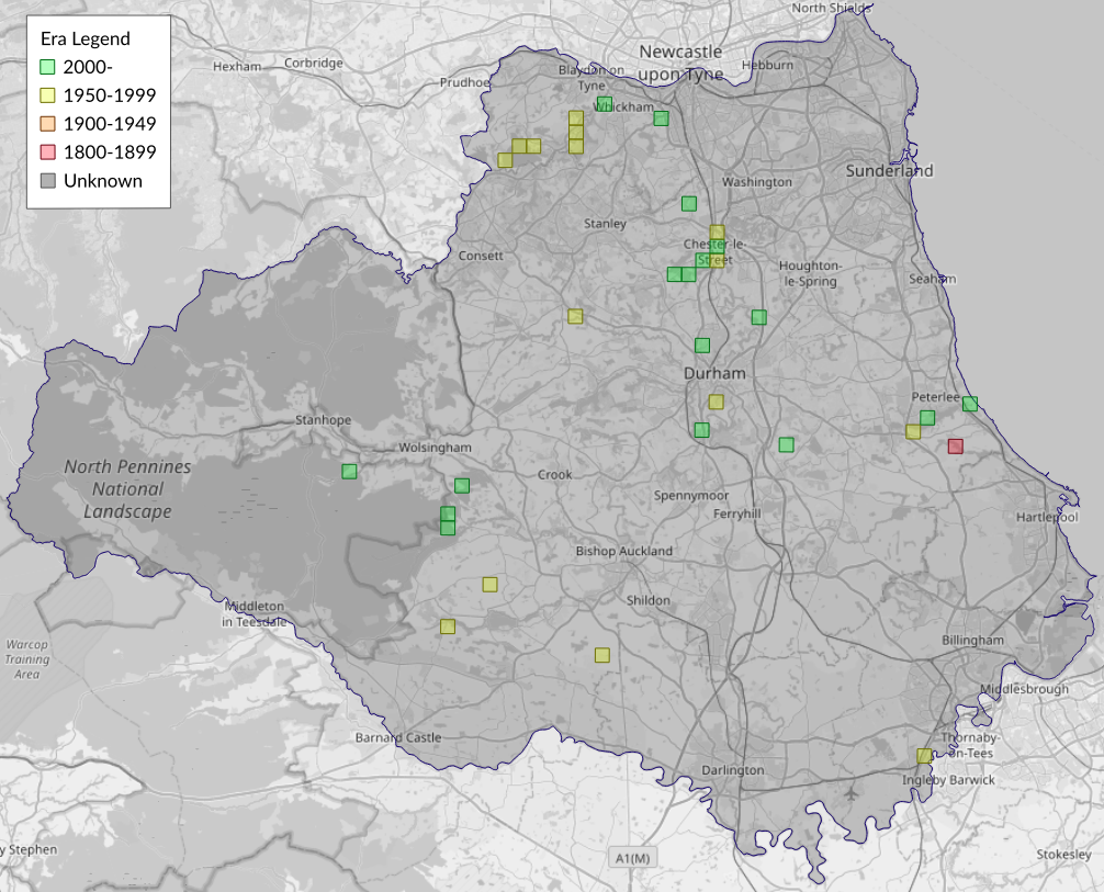 This map shows all records of Flounced Chestnut - Anchoscelis helvola in the Durham (VC66) database per monad (1km grid square). The map can be explored further by zooming and panning, can be reset using the button on the left, and can be filtered by selecting the era. Click on a monad to view a full list of species recorded in it, or its containing hexad (10km grid square).