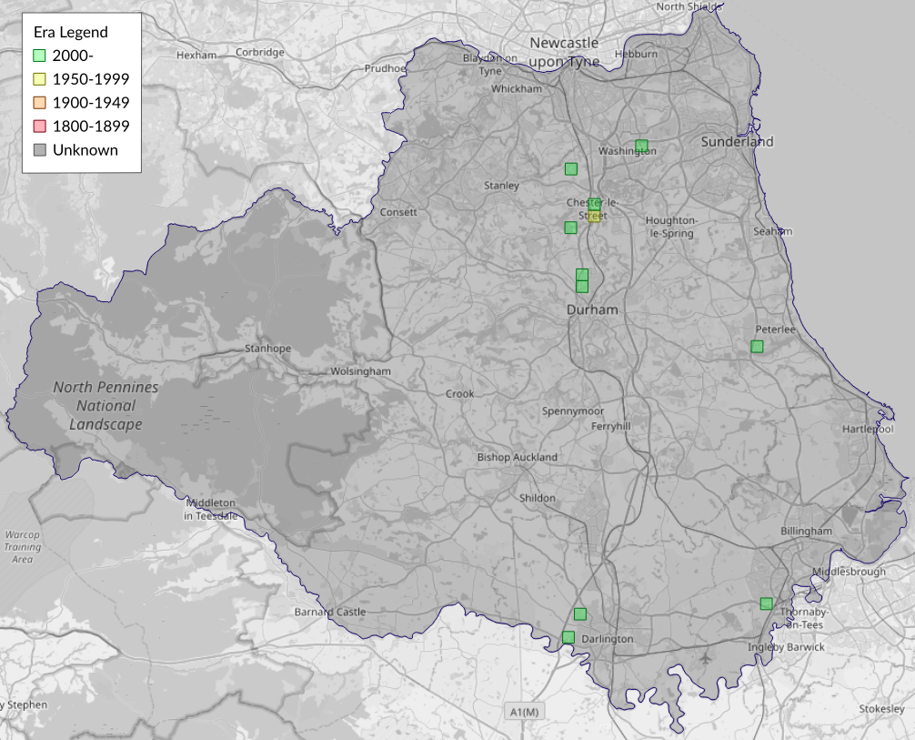 This map shows all records of - Phycita roborella in the Durham (VC66) database per monad (1km grid square). The map can be explored further by zooming and panning, can be reset using the button on the left, and can be filtered by selecting the era. Click on a monad to view a full list of species recorded in it, or its containing hexad (10km grid square).