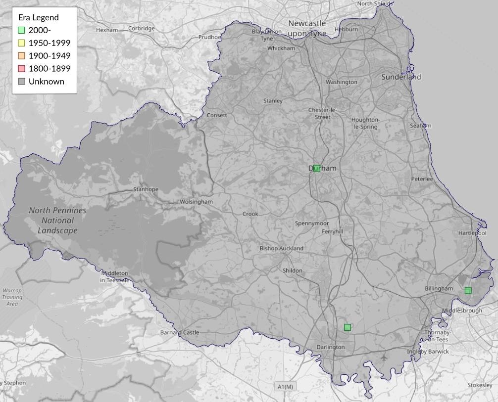 This map shows all records of Bactra lancealana/lacteana agg. - Bactra lancealana/lacteana in the Durham (VC66) database per monad (1km grid square). The map can be explored further by zooming and panning, can be reset using the button on the left, and can be filtered by selecting the era. Click on a monad to view a full list of species recorded in it, or its containing hexad (10km grid square).