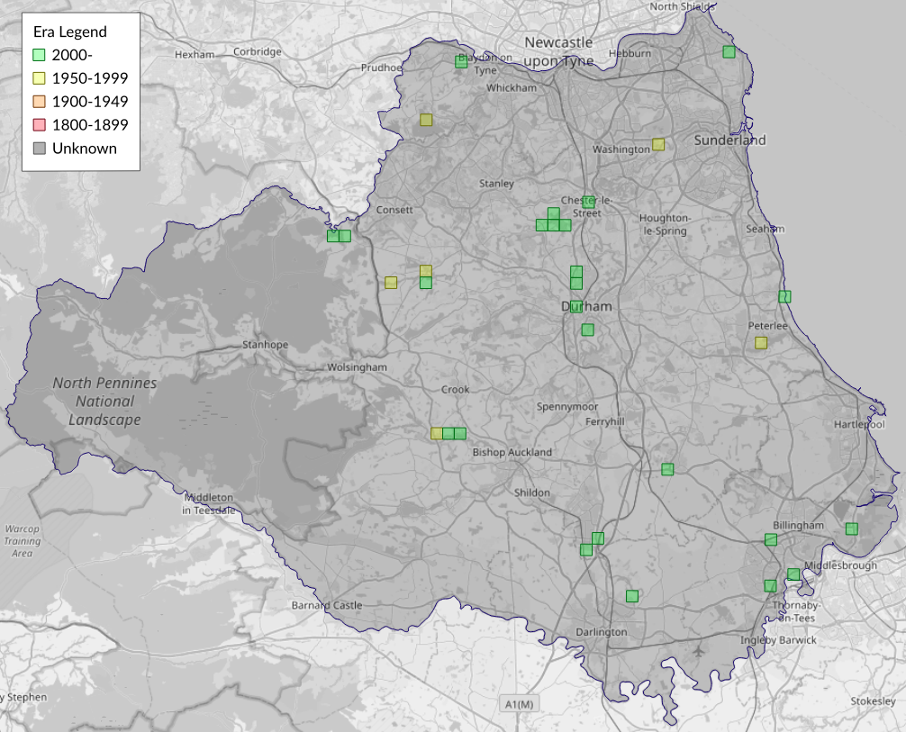 This map shows all records of - Epinotia immundana in the Durham (VC66) database per monad (1km grid square). The map can be explored further by zooming and panning, can be reset using the button on the left, and can be filtered by selecting the era. Click on a monad to view a full list of species recorded in it, or its containing hexad (10km grid square).
