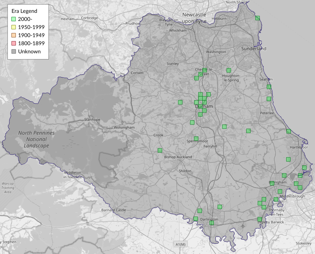 This map shows all records of - Lobesia abscisana in the Durham (VC66) database per monad (1km grid square). The map can be explored further by zooming and panning, can be reset using the button on the left, and can be filtered by selecting the era. Click on a monad to view a full list of species recorded in it, or its containing hexad (10km grid square).