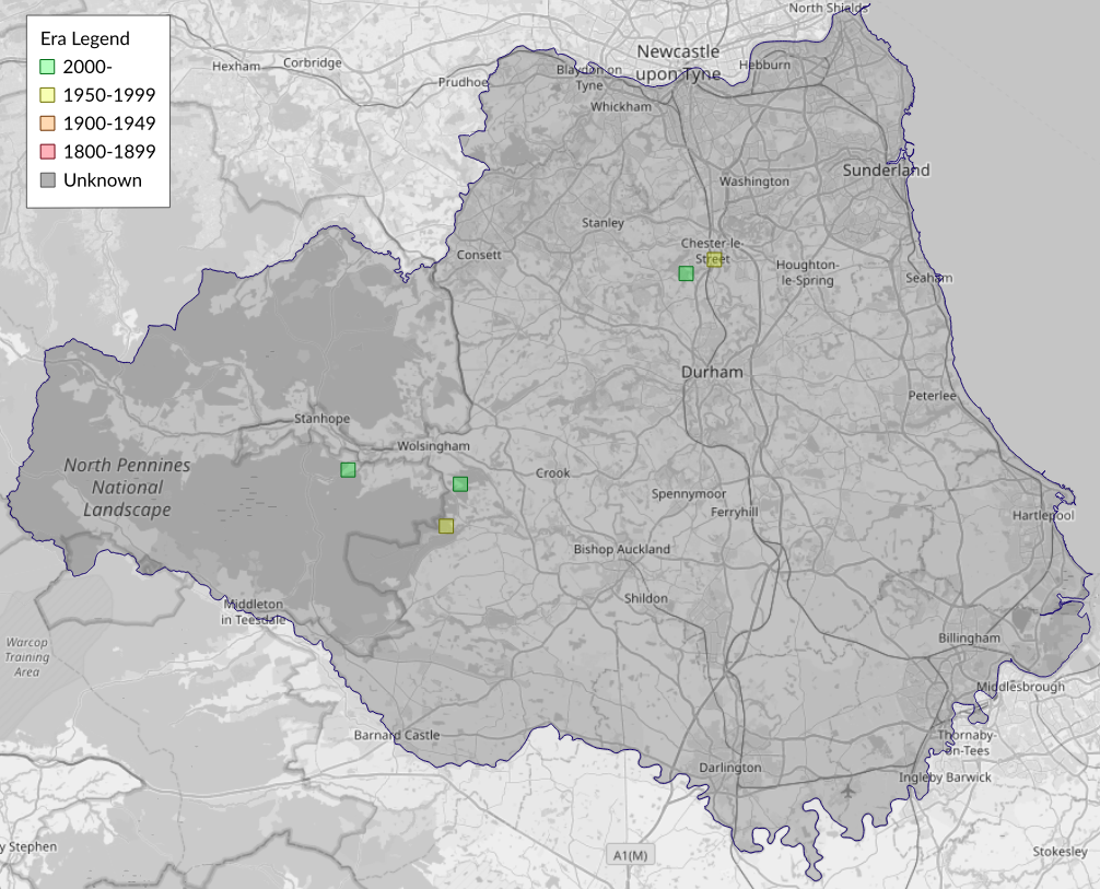 This map shows all records of - Agriphila inquinatella in the Durham (VC66) database per monad (1km grid square). The map can be explored further by zooming and panning, can be reset using the button on the left, and can be filtered by selecting the era. Click on a monad to view a full list of species recorded in it, or its containing hexad (10km grid square).