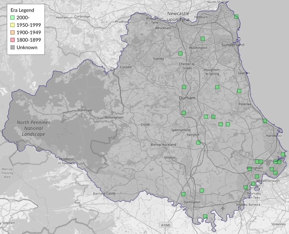This map shows all records of - Anania perlucidalis in the Durham (VC66) database per monad (1km grid square). The map can be explored further by zooming and panning, can be reset using the button on the left, and can be filtered by selecting the era. Click on a monad to view a full list of species recorded in it, or its containing hexad (10km grid square).