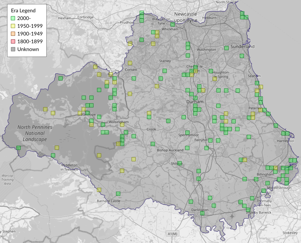This map shows all records of - Crambus lathoniellus in the Durham (VC66) database per monad (1km grid square). The map can be explored further by zooming and panning, can be reset using the button on the left, and can be filtered by selecting the era. Click on a monad to view a full list of species recorded in it, or its containing hexad (10km grid square).