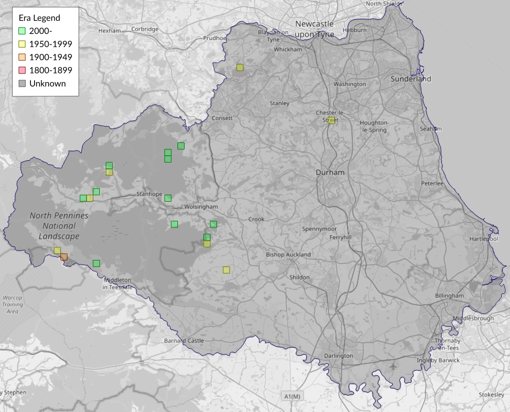 This map shows all records of - Eudonia murana in the Durham (VC66) database per monad (1km grid square). The map can be explored further by zooming and panning, can be reset using the button on the left, and can be filtered by selecting the era. Click on a monad to view a full list of species recorded in it, or its containing hexad (10km grid square).