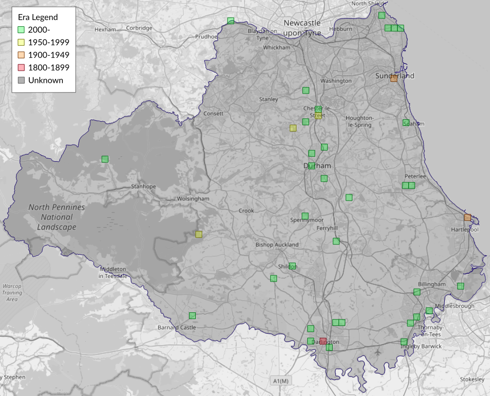 This map shows all records of Rusty-dot Pearl - Udea ferrugalis in the Durham (VC66) database per monad (1km grid square). The map can be explored further by zooming and panning, can be reset using the button on the left, and can be filtered by selecting the era. Click on a monad to view a full list of species recorded in it, or its containing hexad (10km grid square).