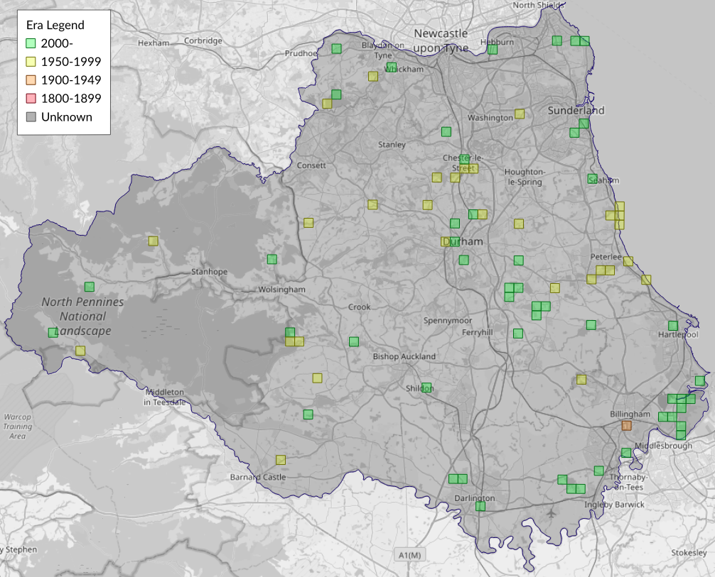 This map shows all records of - Elachista argentella in the Durham (VC66) database per monad (1km grid square). The map can be explored further by zooming and panning, can be reset using the button on the left, and can be filtered by selecting the era. Click on a monad to view a full list of species recorded in it, or its containing hexad (10km grid square).