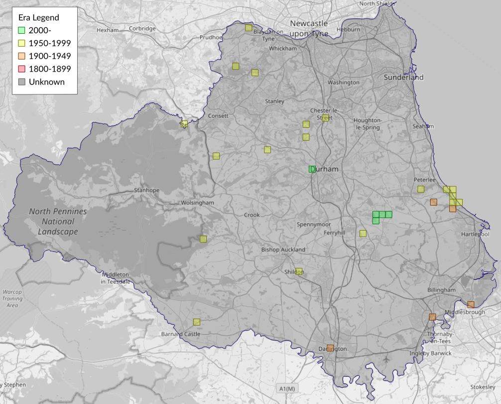 This map shows all records of - Elachista luticomella in the Durham (VC66) database per monad (1km grid square). The map can be explored further by zooming and panning, can be reset using the button on the left, and can be filtered by selecting the era. Click on a monad to view a full list of species recorded in it, or its containing hexad (10km grid square).