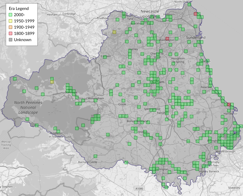 This map shows all records of Cinnabar - Tyria jacobaeae in the Durham (VC66) database per monad (1km grid square). The map can be explored further by zooming and panning, can be reset using the button on the left, and can be filtered by selecting the era. Click on a monad to view a full list of species recorded in it, or its containing hexad (10km grid square).