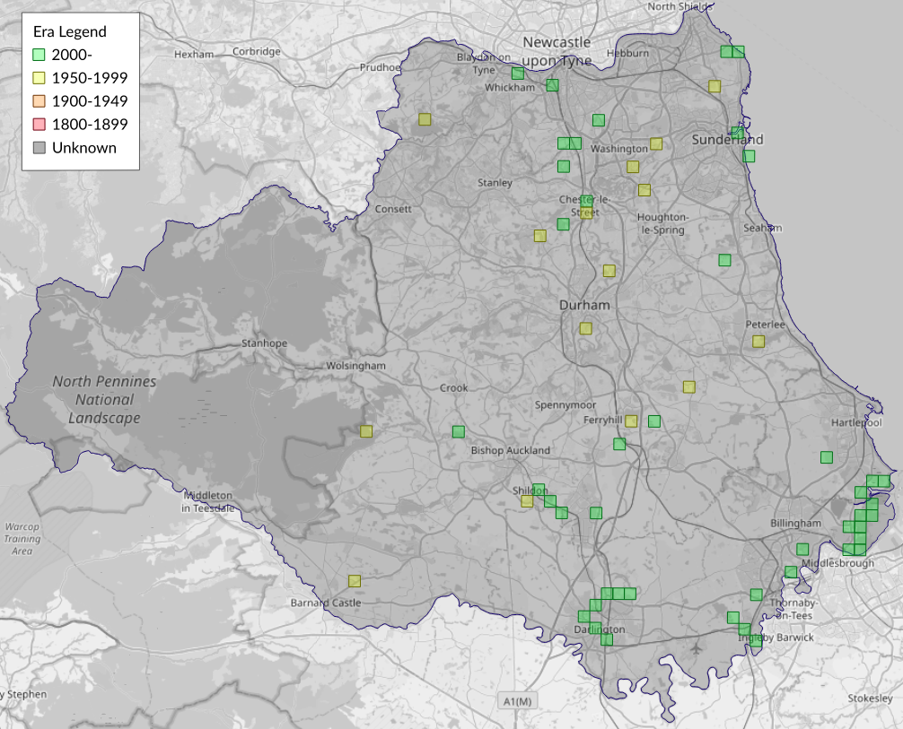 This map shows all records of Lesser Treble-bar - Aplocera efformata in the Durham (VC66) database per monad (1km grid square). The map can be explored further by zooming and panning, can be reset using the button on the left, and can be filtered by selecting the era. Click on a monad to view a full list of species recorded in it, or its containing hexad (10km grid square).