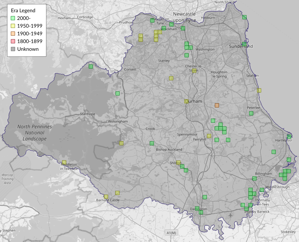 This map shows all records of Treble-bar - Aplocera plagiata in the Durham (VC66) database per monad (1km grid square). The map can be explored further by zooming and panning, can be reset using the button on the left, and can be filtered by selecting the era. Click on a monad to view a full list of species recorded in it, or its containing hexad (10km grid square).