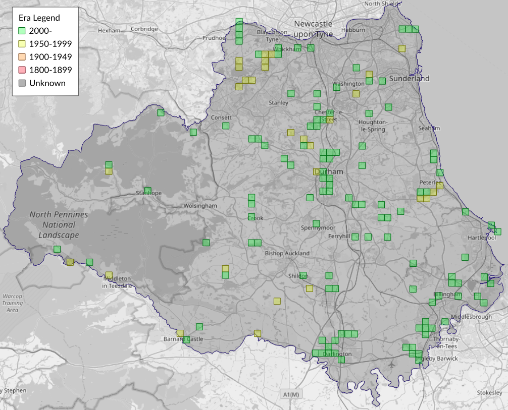 This map shows all records of Barred Yellow - Cidaria fulvata in the Durham (VC66) database per monad (1km grid square). The map can be explored further by zooming and panning, can be reset using the button on the left, and can be filtered by selecting the era. Click on a monad to view a full list of species recorded in it, or its containing hexad (10km grid square).