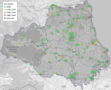 This map shows all records of Scalloped Oak - Crocallis elinguaria in the Durham (VC66) database per monad (1km grid square). The map can be explored further by zooming and panning, can be reset using the button on the left, and can be filtered by selecting the era. Click on a monad to view a full list of species recorded in it, or its containing hexad (10km grid square).