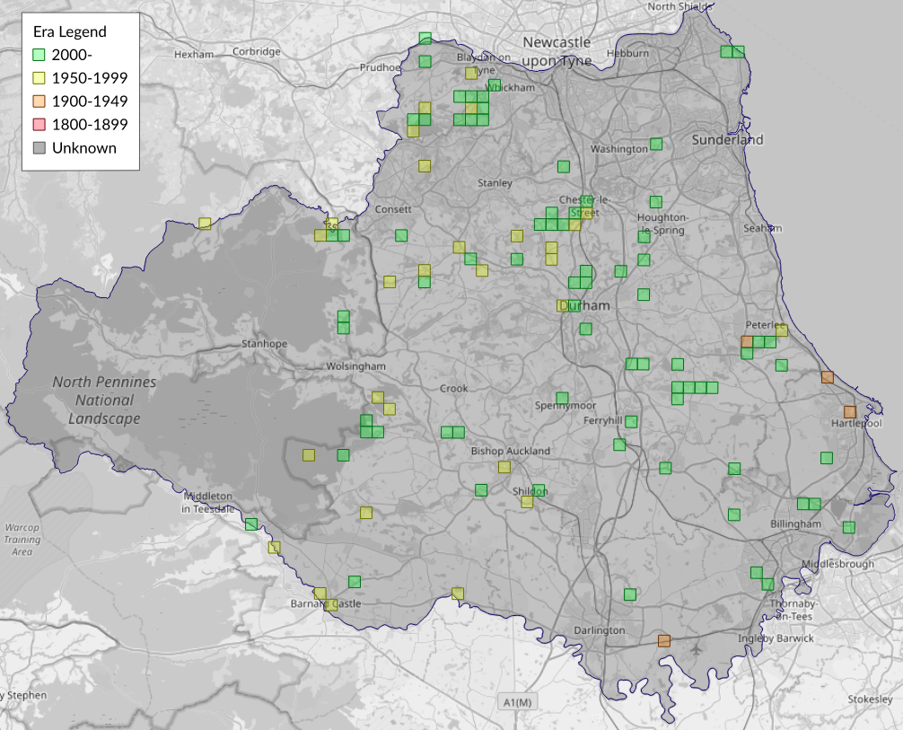 This map shows all records of Engrailed - Ectropis crepuscularia in the Durham (VC66) database per monad (1km grid square). The map can be explored further by zooming and panning, can be reset using the button on the left, and can be filtered by selecting the era. Click on a monad to view a full list of species recorded in it, or its containing hexad (10km grid square).