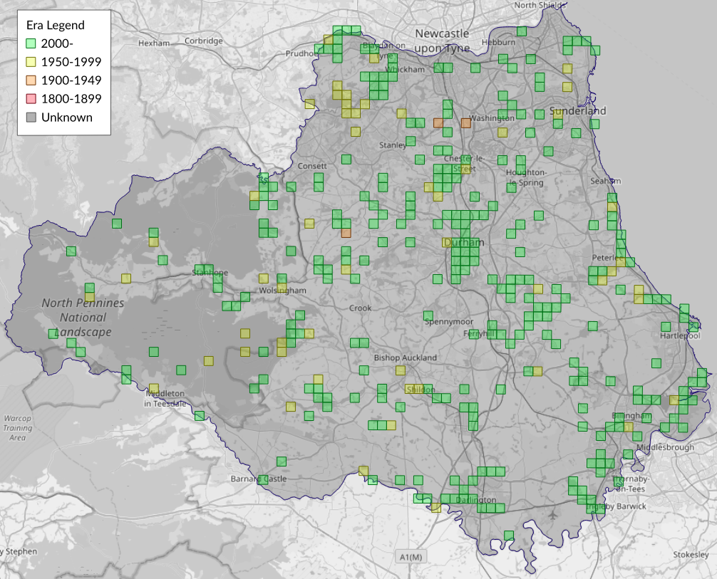 This map shows all records of Common Carpet - Epirrhoe alternata in the Durham (VC66) database per monad (1km grid square). The map can be explored further by zooming and panning, can be reset using the button on the left, and can be filtered by selecting the era. Click on a monad to view a full list of species recorded in it, or its containing hexad (10km grid square).