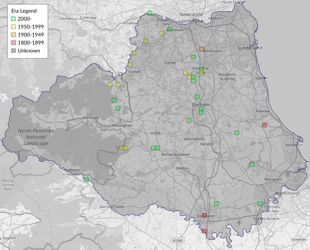 This map shows all records of Dingy Shell - Euchoeca nebulata in the Durham (VC66) database per monad (1km grid square). The map can be explored further by zooming and panning, can be reset using the button on the left, and can be filtered by selecting the era. Click on a monad to view a full list of species recorded in it, or its containing hexad (10km grid square).