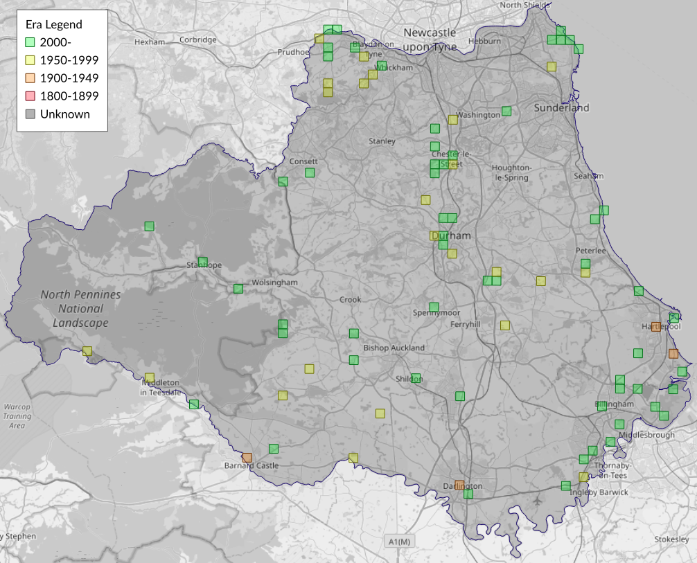 This map shows all records of Tawny Speckled Pug - Eupithecia icterata in the Durham (VC66) database per monad (1km grid square). The map can be explored further by zooming and panning, can be reset using the button on the left, and can be filtered by selecting the era. Click on a monad to view a full list of species recorded in it, or its containing hexad (10km grid square).