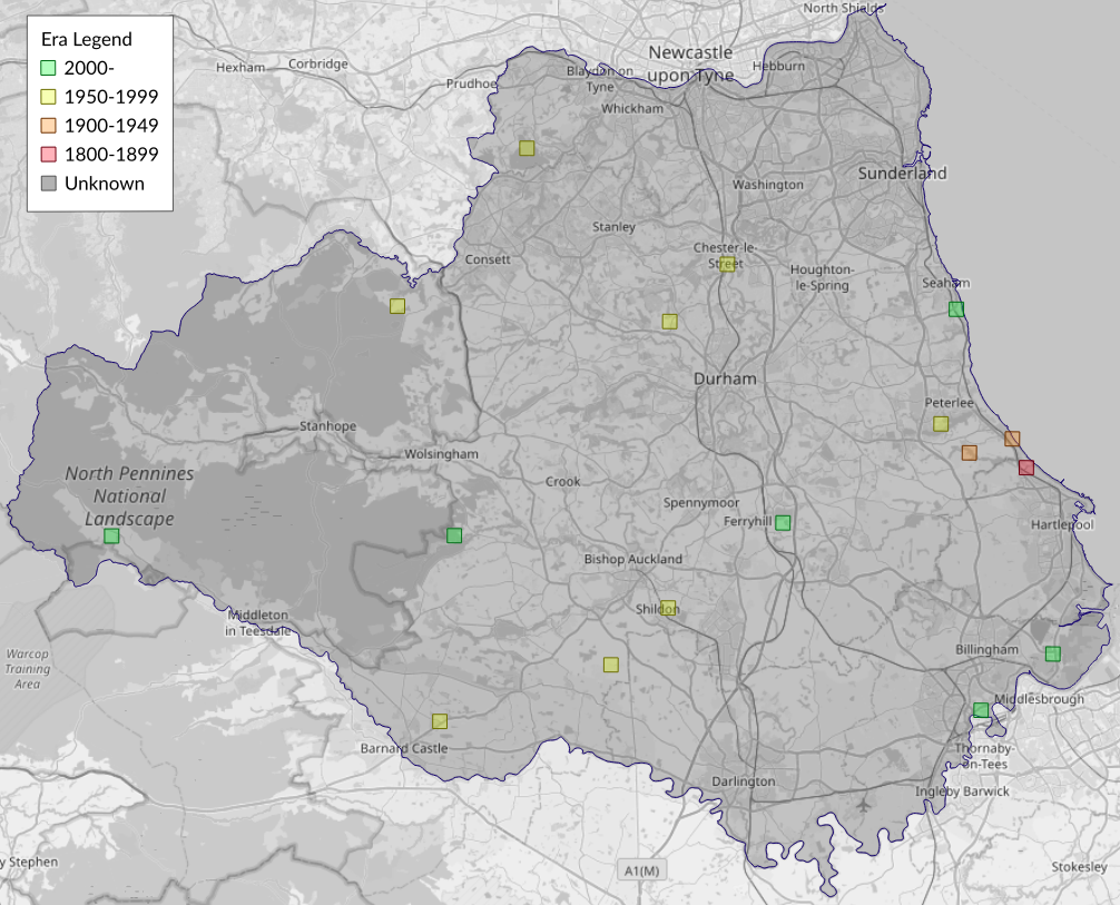 This map shows all records of Satyr Pug - Eupithecia satyrata in the Durham (VC66) database per monad (1km grid square). The map can be explored further by zooming and panning, can be reset using the button on the left, and can be filtered by selecting the era. Click on a monad to view a full list of species recorded in it, or its containing hexad (10km grid square).