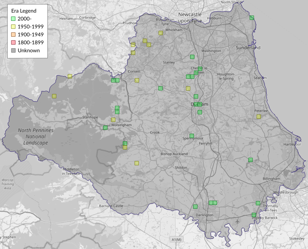 This map shows all records of Dwarf Pug - Eupithecia tantillaria in the Durham (VC66) database per monad (1km grid square). The map can be explored further by zooming and panning, can be reset using the button on the left, and can be filtered by selecting the era. Click on a monad to view a full list of species recorded in it, or its containing hexad (10km grid square).
