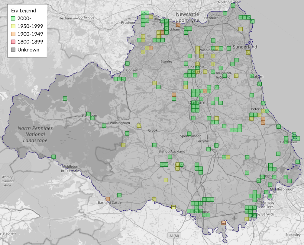 This map shows all records of Swallow-tailed Moth - Ourapteryx sambucaria in the Durham (VC66) database per monad (1km grid square). The map can be explored further by zooming and panning, can be reset using the button on the left, and can be filtered by selecting the era. Click on a monad to view a full list of species recorded in it, or its containing hexad (10km grid square).