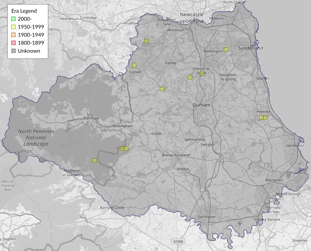 This map shows all records of - Caloptilia betulicola in the Durham (VC66) database per monad (1km grid square). The map can be explored further by zooming and panning, can be reset using the button on the left, and can be filtered by selecting the era. Click on a monad to view a full list of species recorded in it, or its containing hexad (10km grid square).