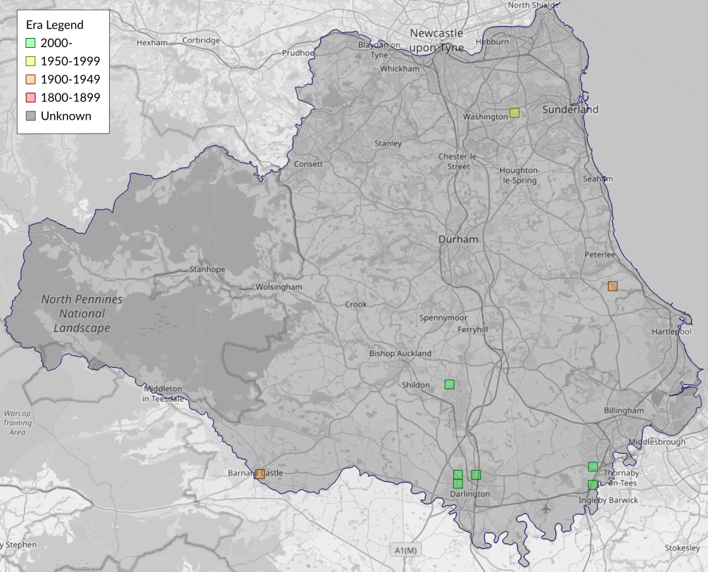 This map shows all records of - Phyllonorycter emberizaepenella in the Durham (VC66) database per monad (1km grid square). The map can be explored further by zooming and panning, can be reset using the button on the left, and can be filtered by selecting the era. Click on a monad to view a full list of species recorded in it, or its containing hexad (10km grid square).