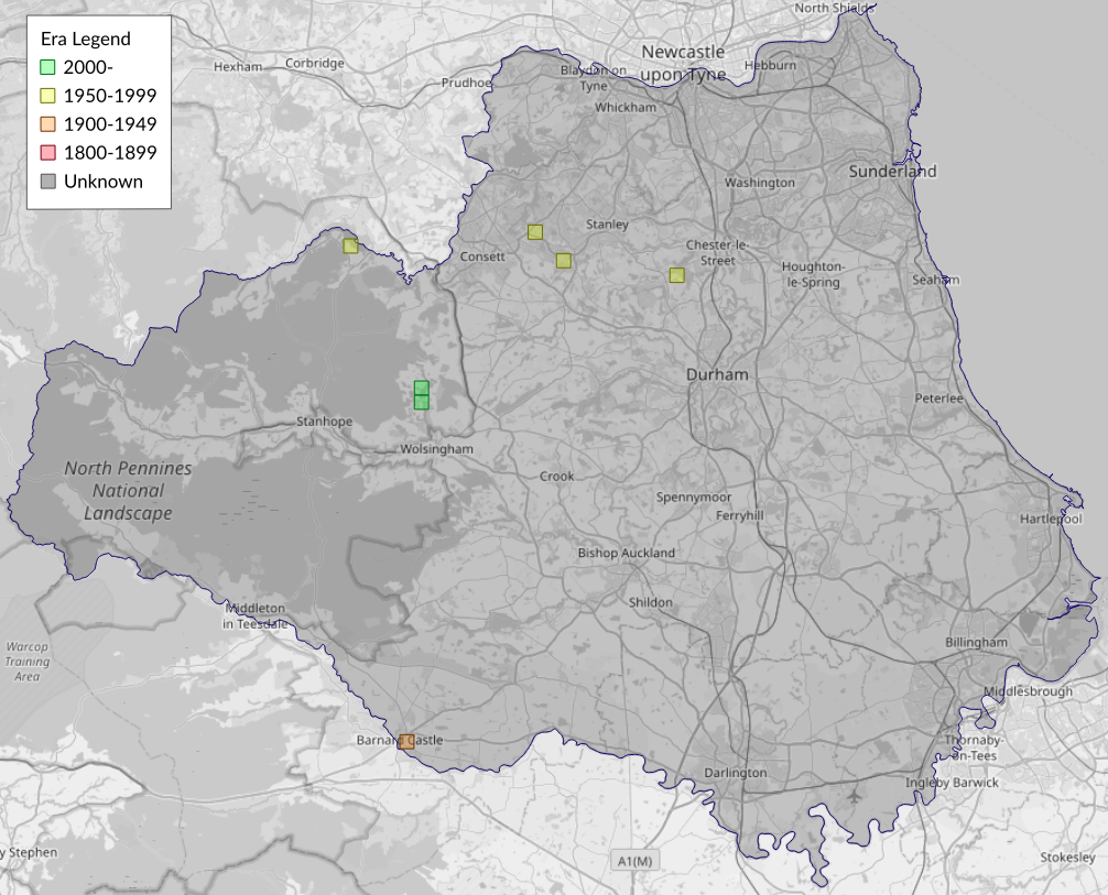 This map shows all records of - Stigmella myrtillella in the Durham (VC66) database per monad (1km grid square). The map can be explored further by zooming and panning, can be reset using the button on the left, and can be filtered by selecting the era. Click on a monad to view a full list of species recorded in it, or its containing hexad (10km grid square).