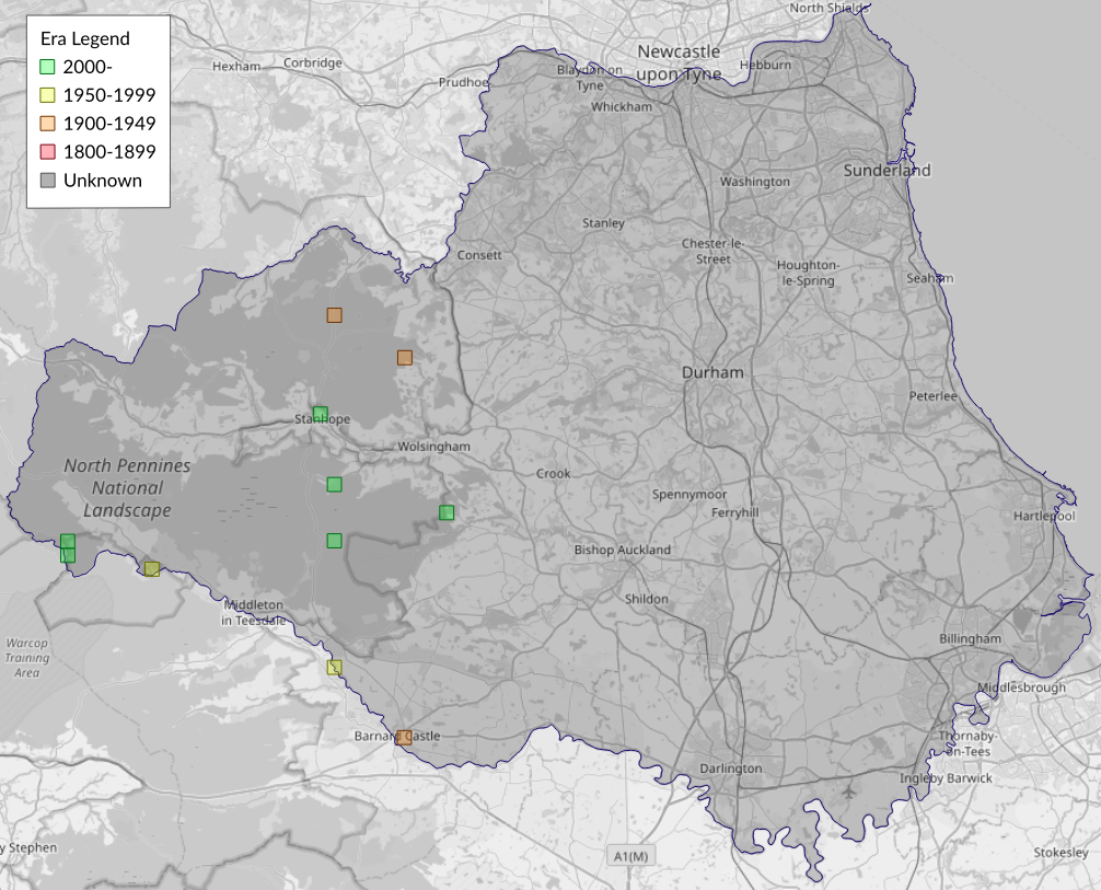 This map shows all records of Light Knot Grass - Acronicta menyanthidis in the Durham (VC66) database per monad (1km grid square). The map can be explored further by zooming and panning, can be reset using the button on the left, and can be filtered by selecting the era. Click on a monad to view a full list of species recorded in it, or its containing hexad (10km grid square).