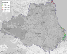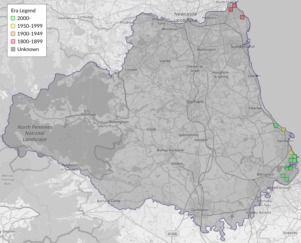 This map shows all records of Archer's Dart - Agrotis vestigialis in the Durham (VC66) database per monad (1km grid square). The map can be explored further by zooming and panning, can be reset using the button on the left, and can be filtered by selecting the era. Click on a monad to view a full list of species recorded in it, or its containing hexad (10km grid square).