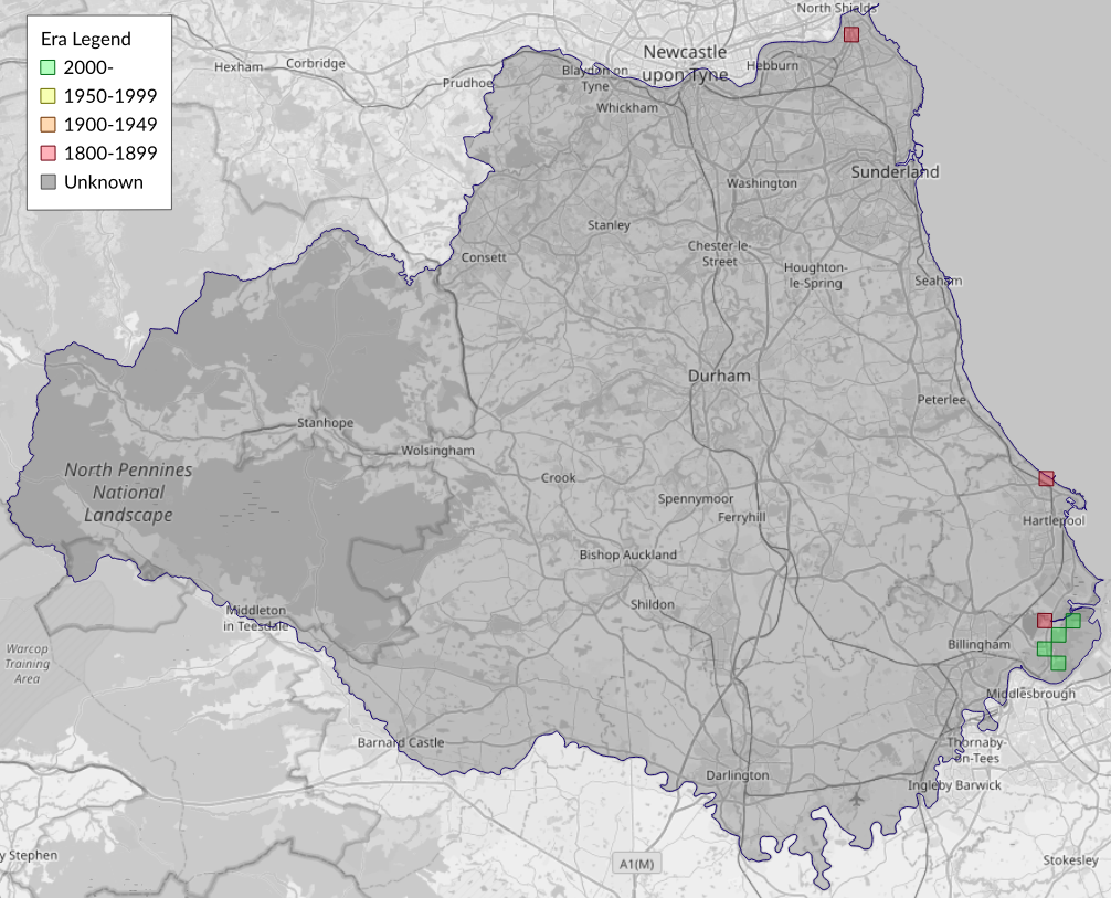 This map shows all records of Crescent Striped - Apamea oblonga in the Durham (VC66) database per monad (1km grid square). The map can be explored further by zooming and panning, can be reset using the button on the left, and can be filtered by selecting the era. Click on a monad to view a full list of species recorded in it, or its containing hexad (10km grid square).