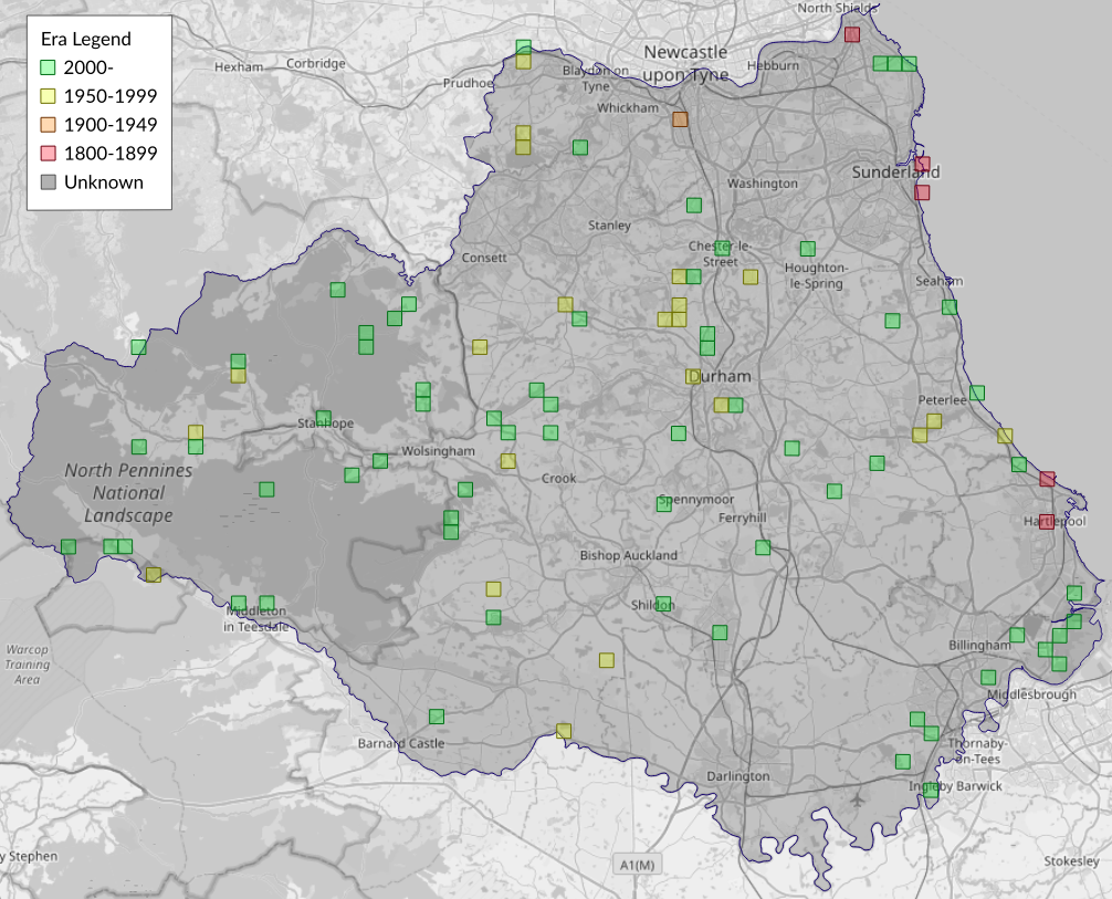 This map shows all records of Broom Moth - Ceramica pisi in the Durham (VC66) database per monad (1km grid square). The map can be explored further by zooming and panning, can be reset using the button on the left, and can be filtered by selecting the era. Click on a monad to view a full list of species recorded in it, or its containing hexad (10km grid square).