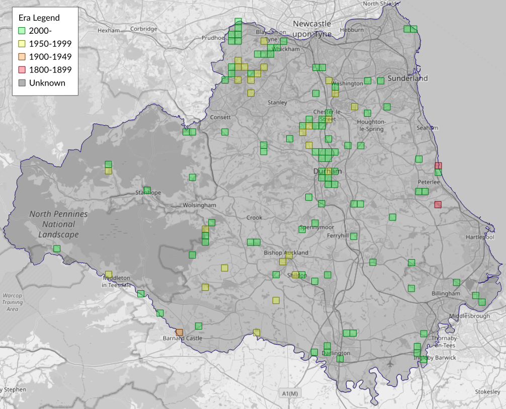 This map shows all records of Chestnut - Conistra vaccinii in the Durham (VC66) database per monad (1km grid square). The map can be explored further by zooming and panning, can be reset using the button on the left, and can be filtered by selecting the era. Click on a monad to view a full list of species recorded in it, or its containing hexad (10km grid square).