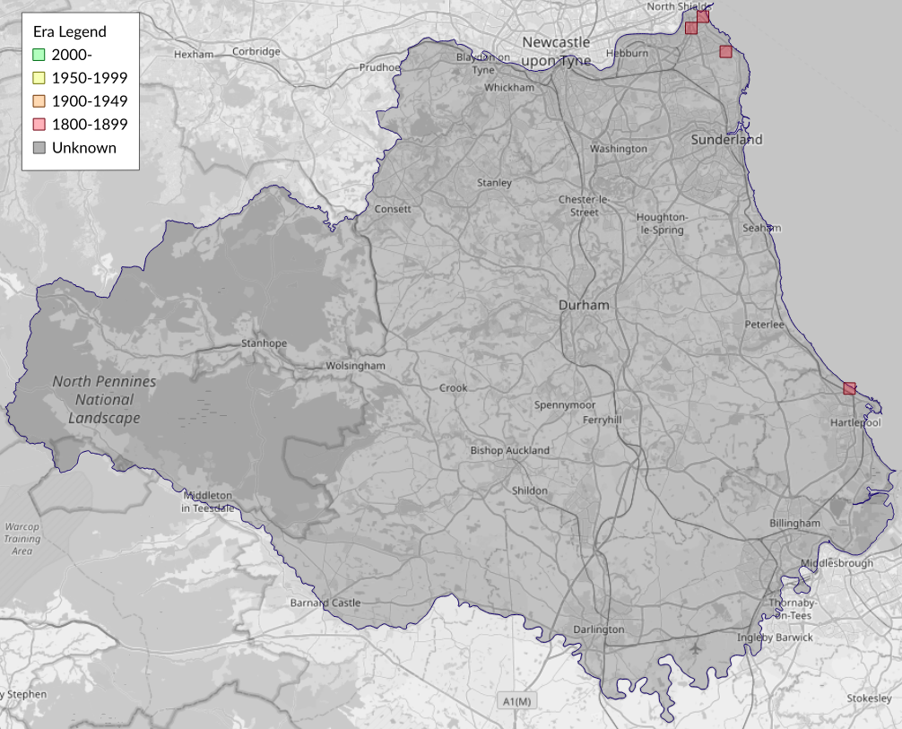 This map shows all records of Coast Dart - Euxoa cursoria in the Durham (VC66) database per monad (1km grid square). The map can be explored further by zooming and panning, can be reset using the button on the left, and can be filtered by selecting the era. Click on a monad to view a full list of species recorded in it, or its containing hexad (10km grid square).