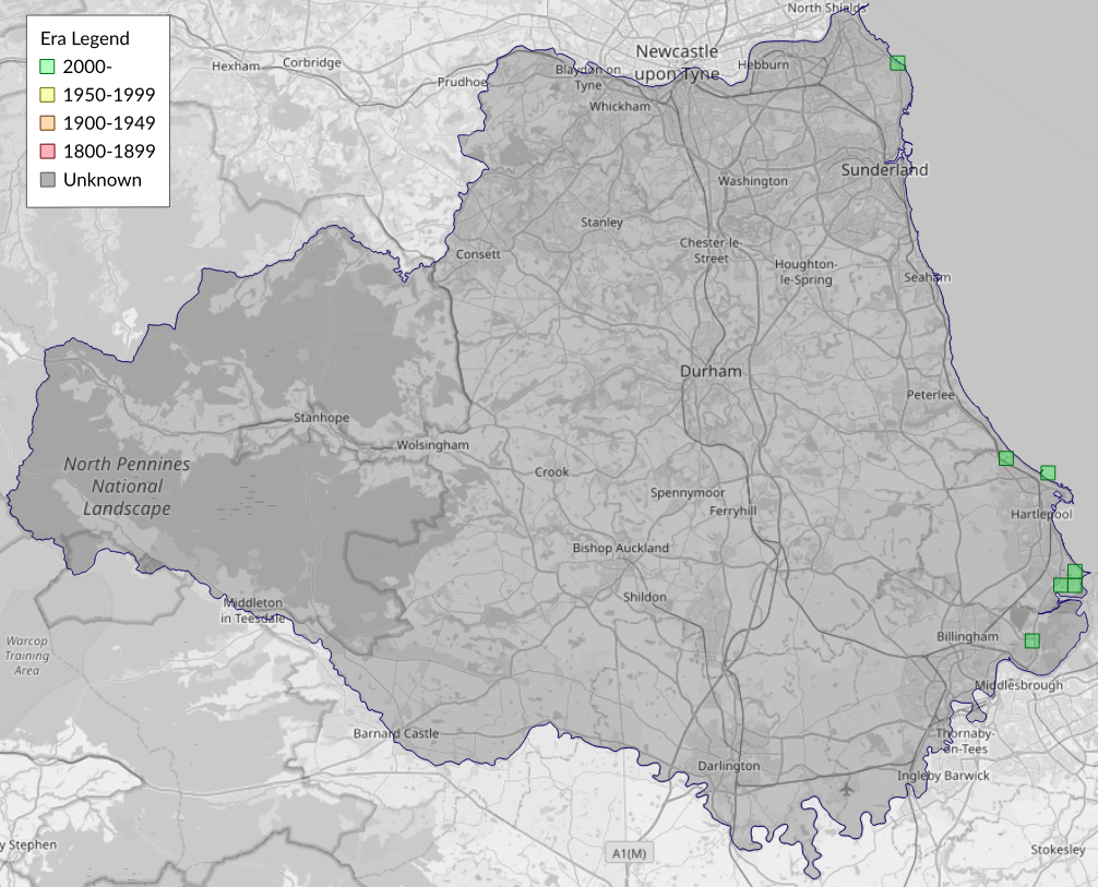 This map shows all records of Shore Wainscot - Mythimna litoralis in the Durham (VC66) database per monad (1km grid square). The map can be explored further by zooming and panning, can be reset using the button on the left, and can be filtered by selecting the era. Click on a monad to view a full list of species recorded in it, or its containing hexad (10km grid square).
