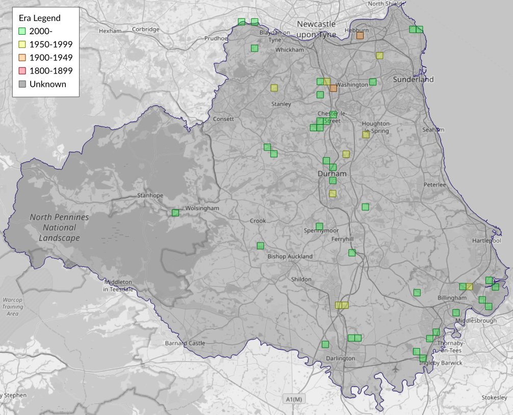 This map shows all records of Bulrush Wainscot - Nonagria typhae in the Durham (VC66) database per monad (1km grid square). The map can be explored further by zooming and panning, can be reset using the button on the left, and can be filtered by selecting the era. Click on a monad to view a full list of species recorded in it, or its containing hexad (10km grid square).
