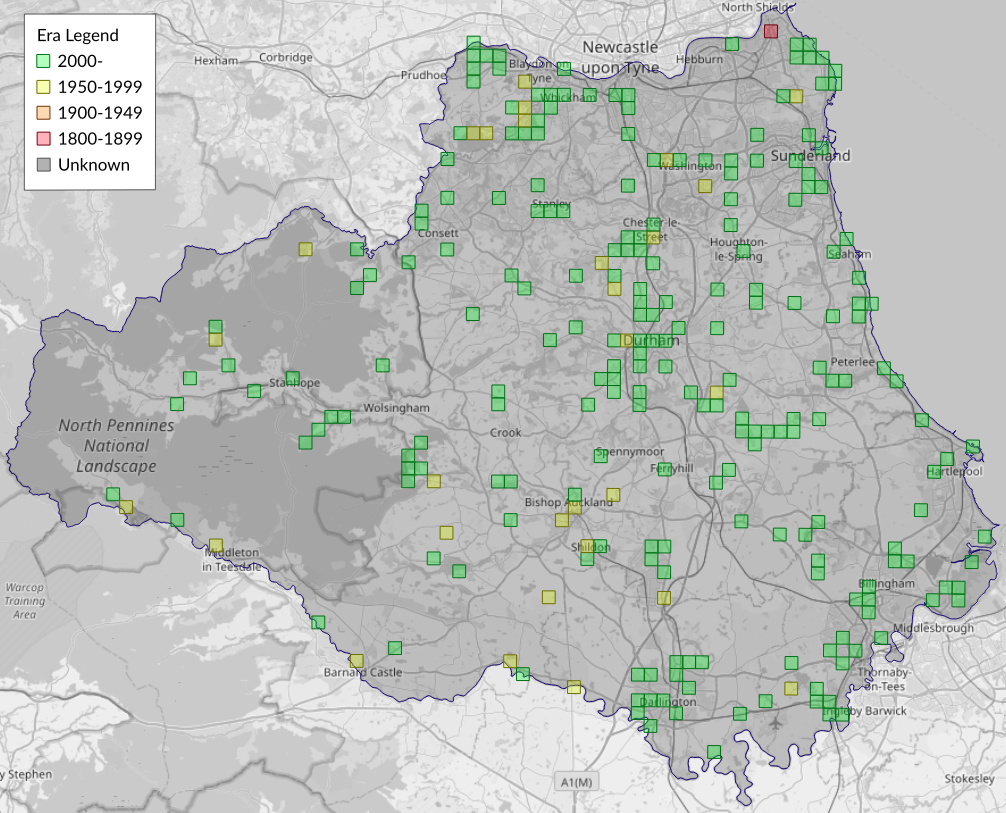 This map shows all records of Angle Shades - Phlogophora meticulosa in the Durham (VC66) database per monad (1km grid square). The map can be explored further by zooming and panning, can be reset using the button on the left, and can be filtered by selecting the era. Click on a monad to view a full list of species recorded in it, or its containing hexad (10km grid square).
