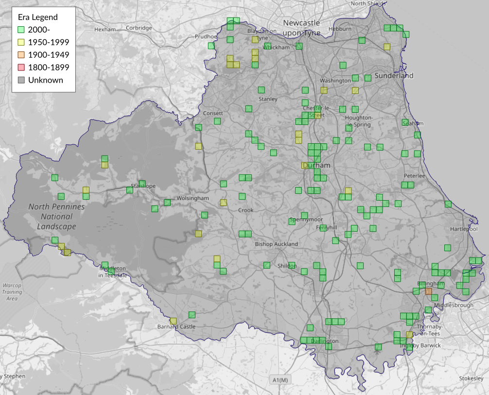 This map shows all records of Gold Spot - Plusia festucae in the Durham (VC66) database per monad (1km grid square). The map can be explored further by zooming and panning, can be reset using the button on the left, and can be filtered by selecting the era. Click on a monad to view a full list of species recorded in it, or its containing hexad (10km grid square).