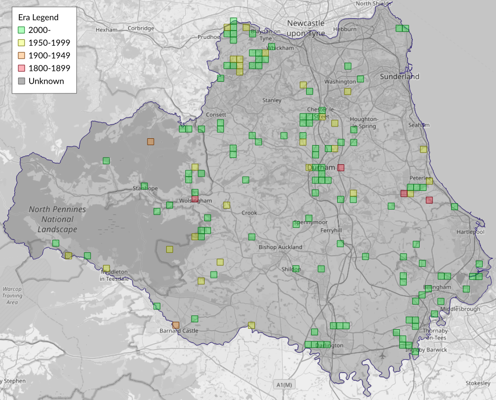This map shows all records of Lesser Swallow Prominent - Pheosia gnoma in the Durham (VC66) database per monad (1km grid square). The map can be explored further by zooming and panning, can be reset using the button on the left, and can be filtered by selecting the era. Click on a monad to view a full list of species recorded in it, or its containing hexad (10km grid square).