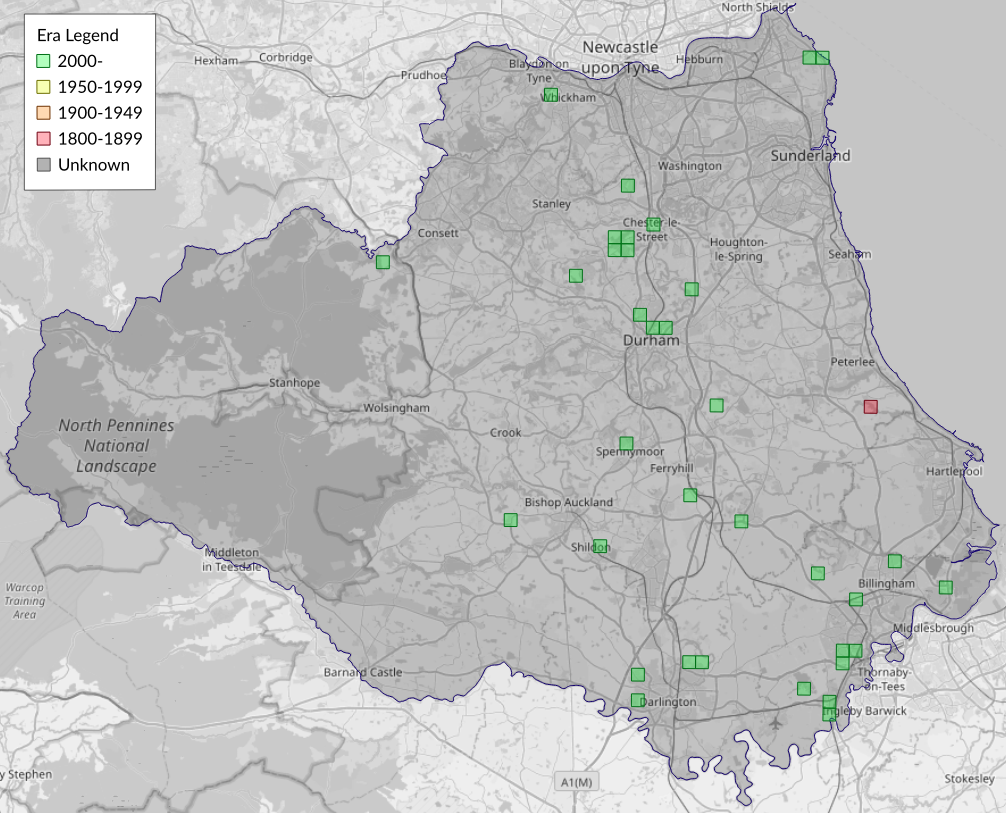 This map shows all records of - Hypsopygia glaucinalis in the Durham (VC66) database per monad (1km grid square). The map can be explored further by zooming and panning, can be reset using the button on the left, and can be filtered by selecting the era. Click on a monad to view a full list of species recorded in it, or its containing hexad (10km grid square).