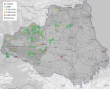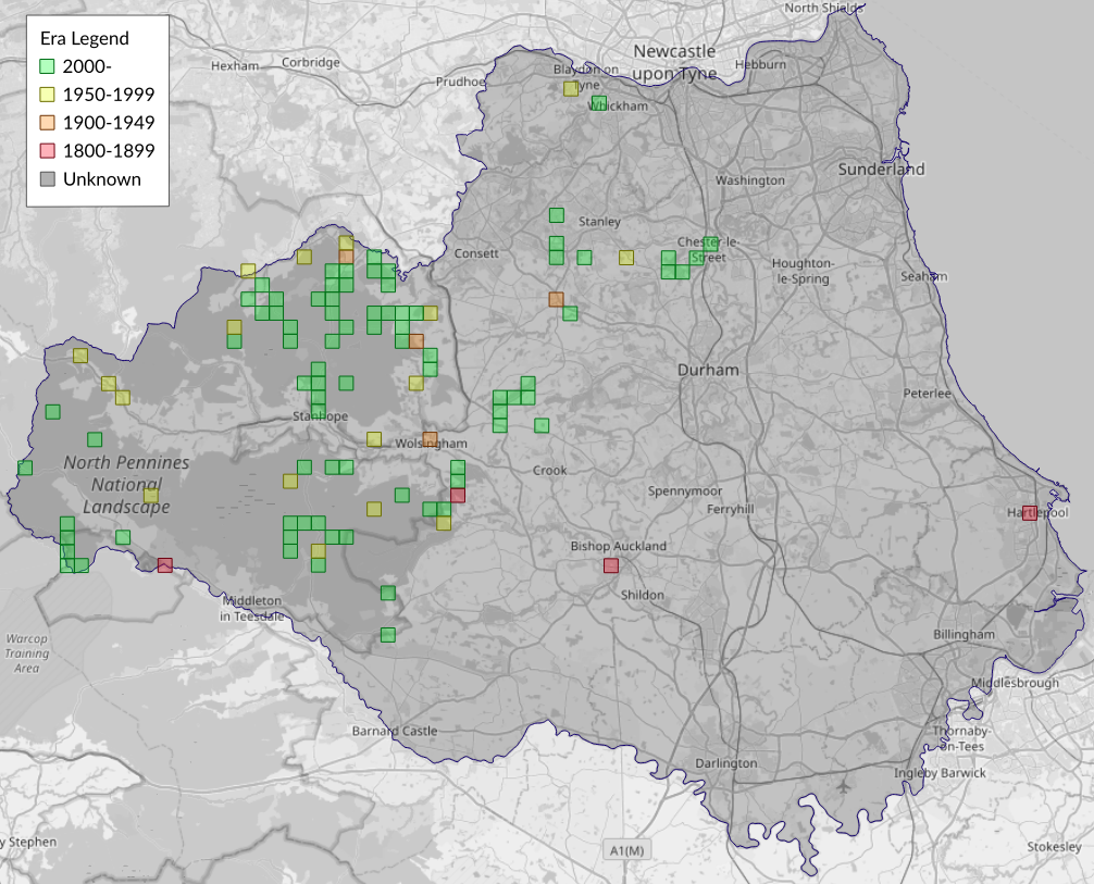 This map shows all records of Emperor Moth - Saturnia pavonia in the Durham (VC66) database per monad (1km grid square). The map can be explored further by zooming and panning, can be reset using the button on the left, and can be filtered by selecting the era. Click on a monad to view a full list of species recorded in it, or its containing hexad (10km grid square).