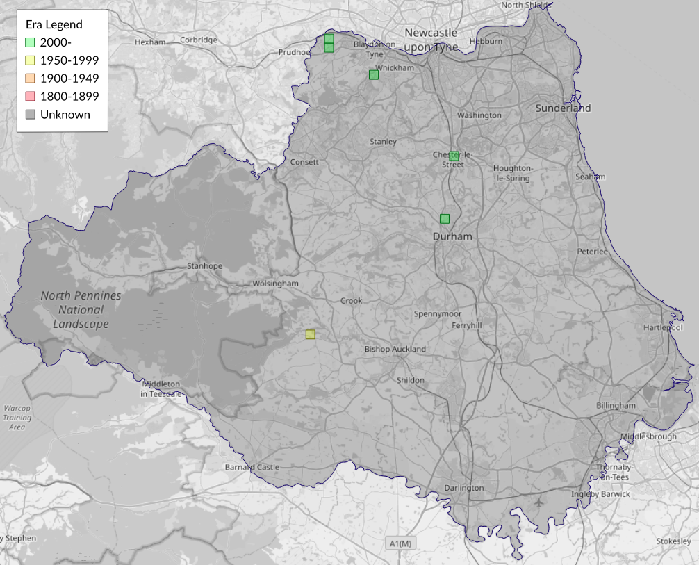 This map shows all records of - Acleris laterana in the Durham (VC66) database per monad (1km grid square). The map can be explored further by zooming and panning, can be reset using the button on the left, and can be filtered by selecting the era. Click on a monad to view a full list of species recorded in it, or its containing hexad (10km grid square).