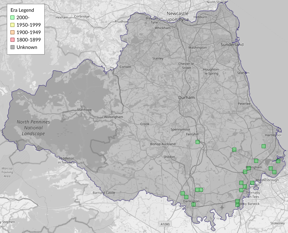 This map shows all records of - Ancylis achatana in the Durham (VC66) database per monad (1km grid square). The map can be explored further by zooming and panning, can be reset using the button on the left, and can be filtered by selecting the era. Click on a monad to view a full list of species recorded in it, or its containing hexad (10km grid square).